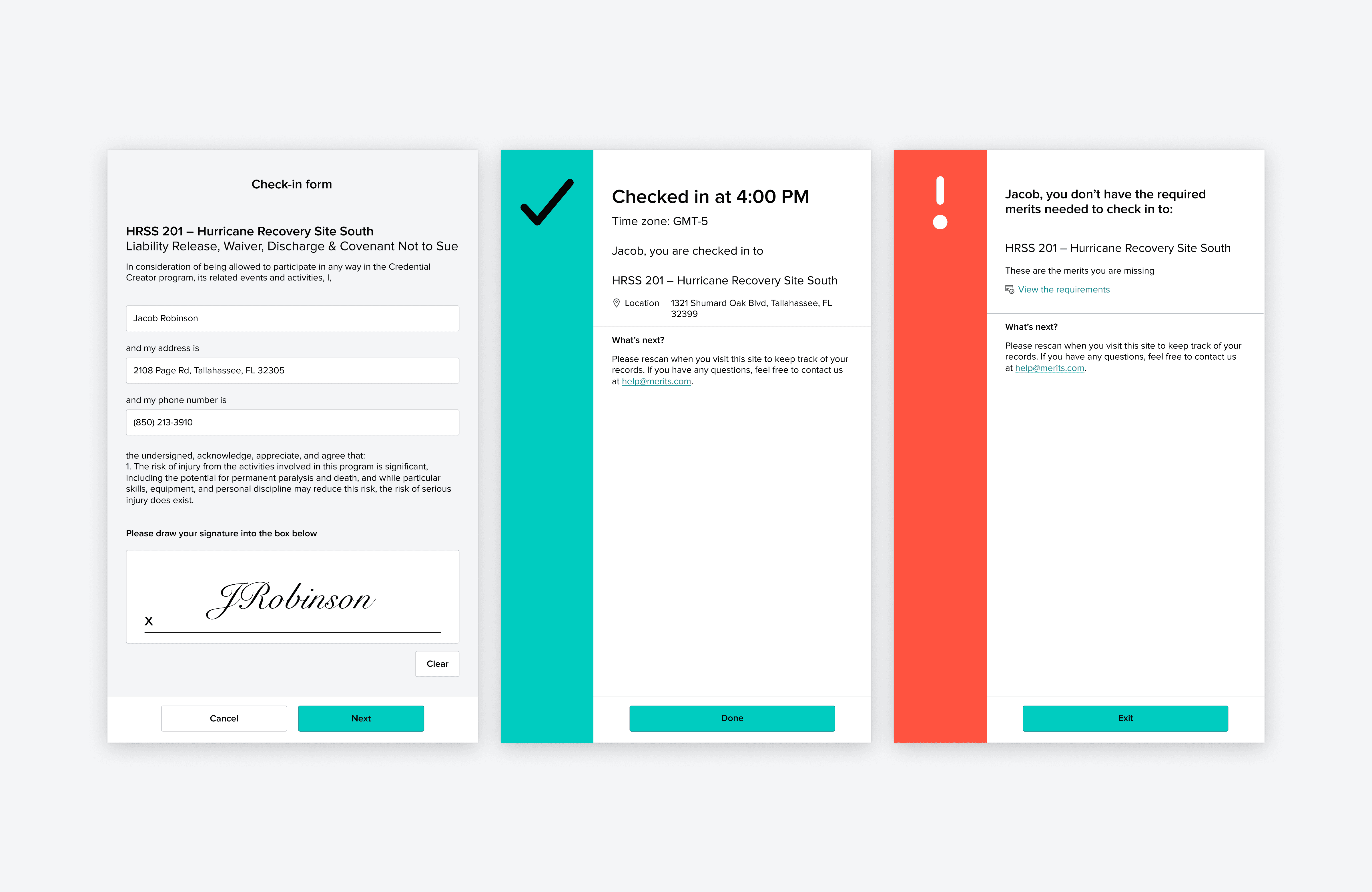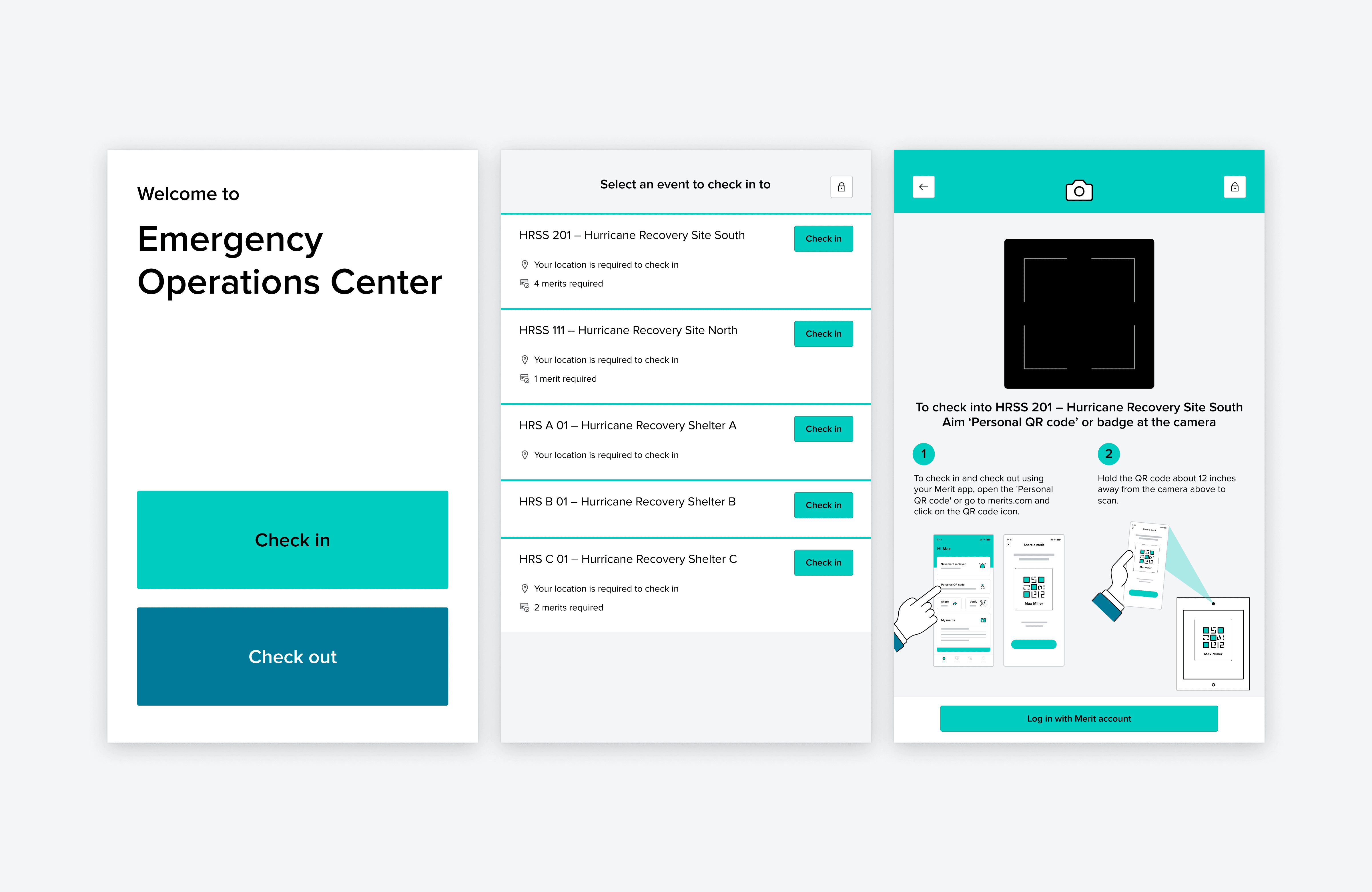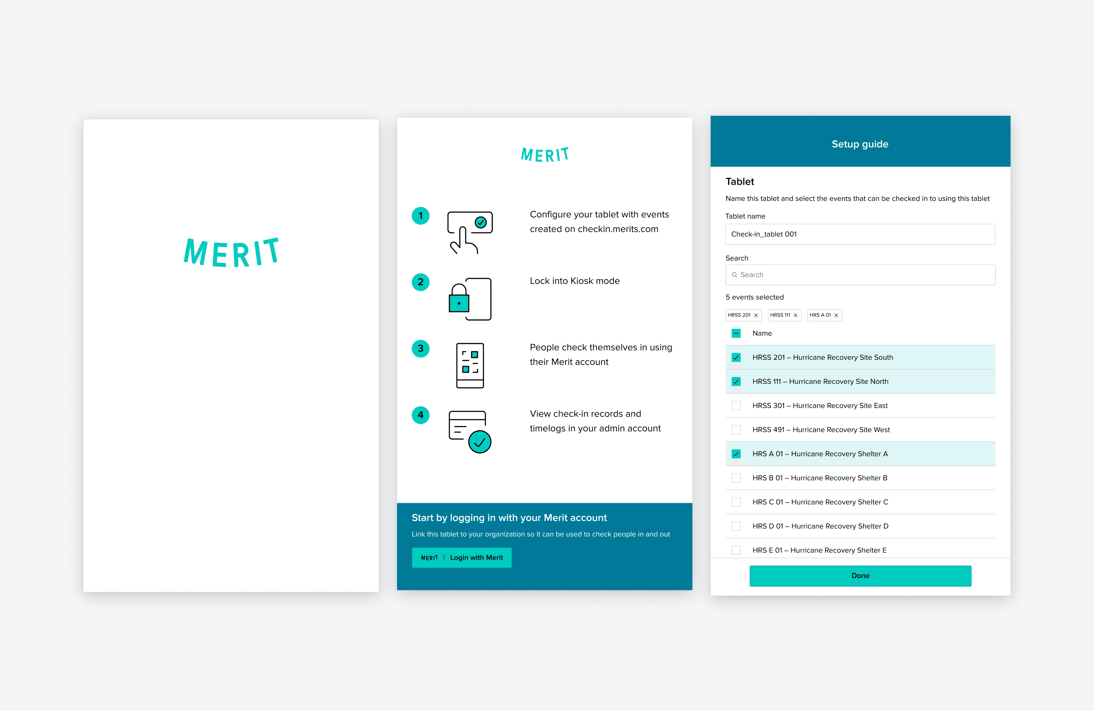 I led the design of the Merit Check-in Kiosk App, including the Admin side, which manages and sets up the kiosk. I also designed the dashboard for reporting. One of the most successful use cases of the Merit Check-in Kiosk has been helping first responders and volunteers at hurricane emergency sites.